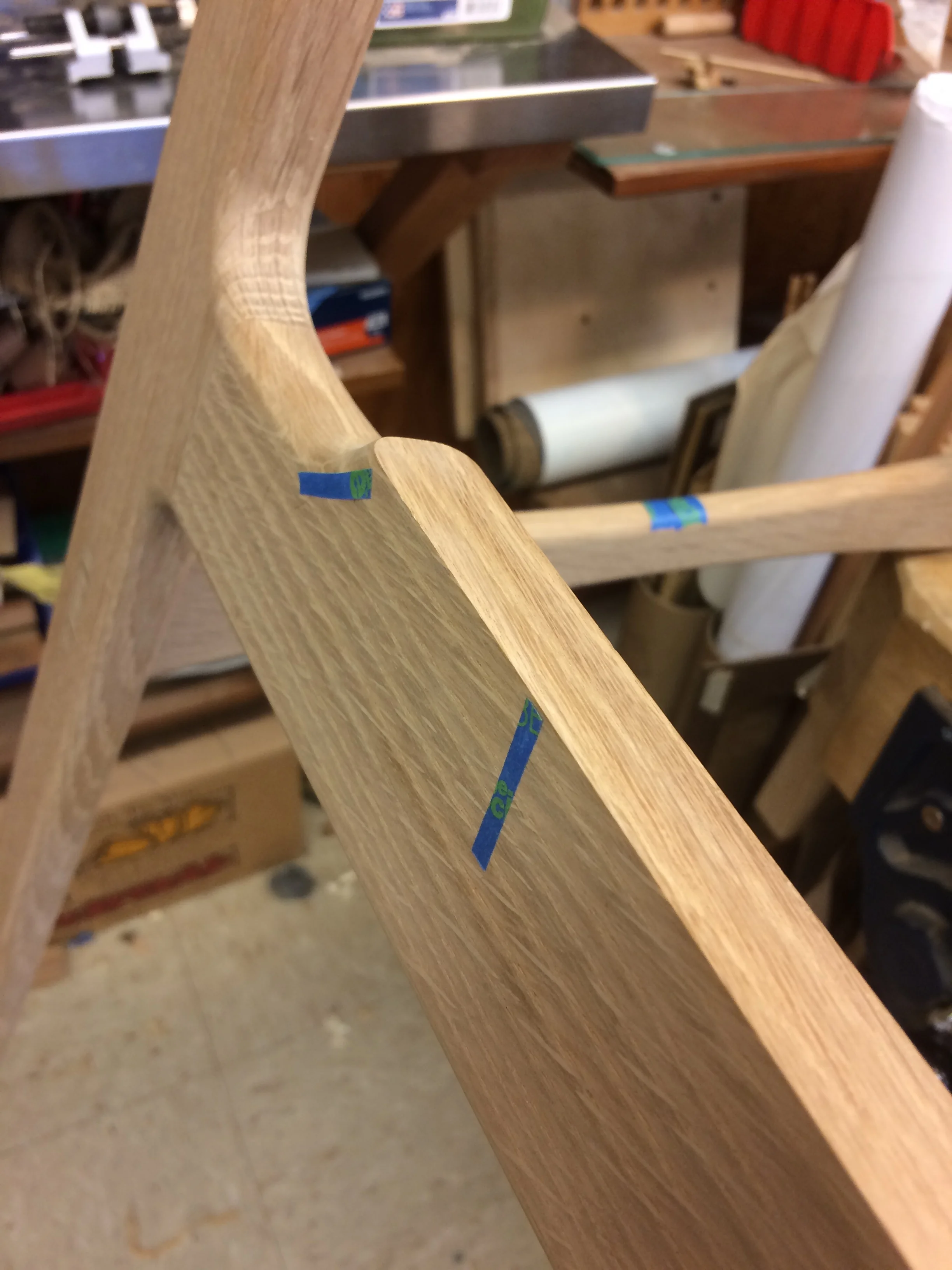 High spots are marked for hand planing to create a perfectly mating joint with the seat shell.