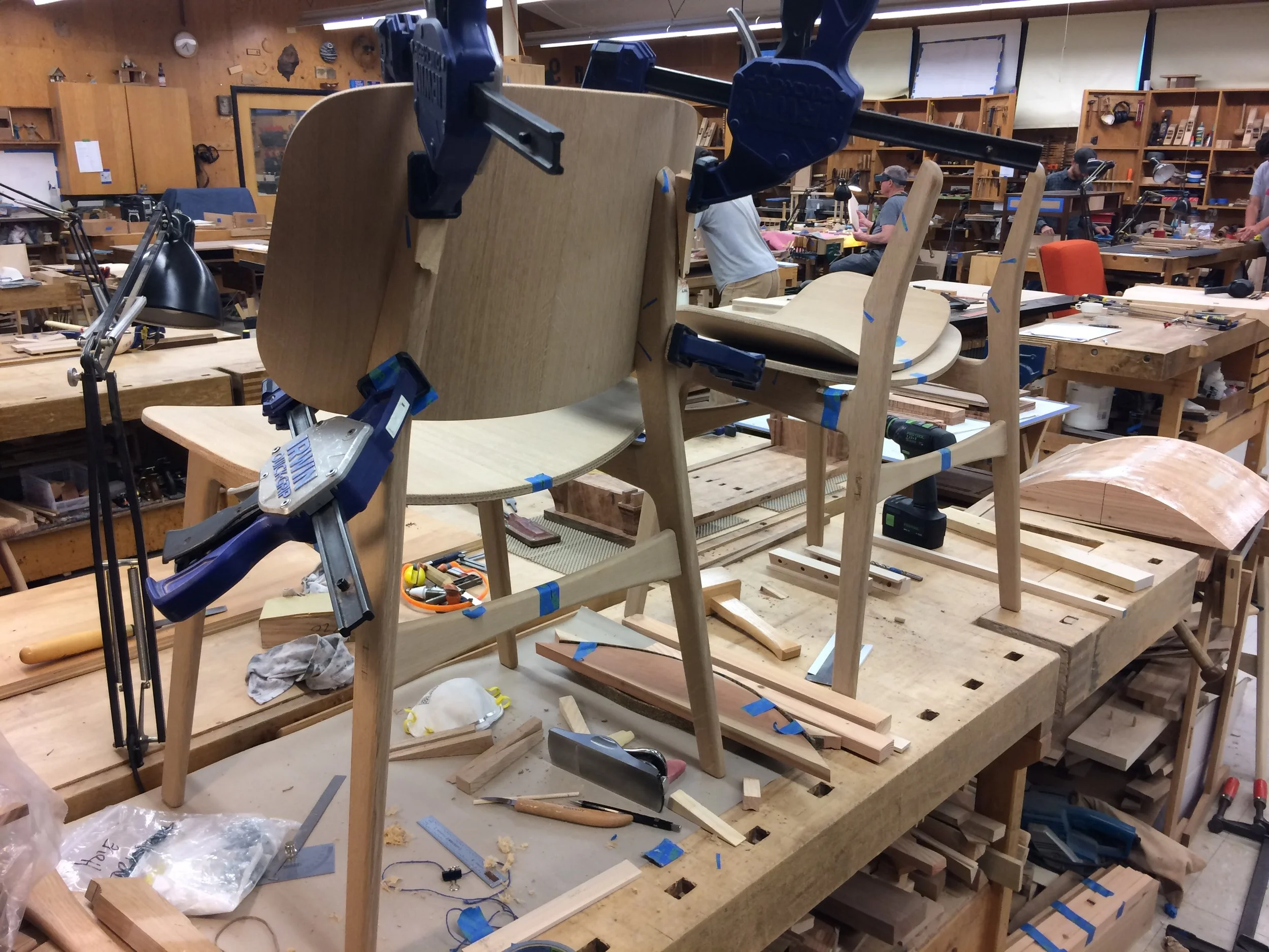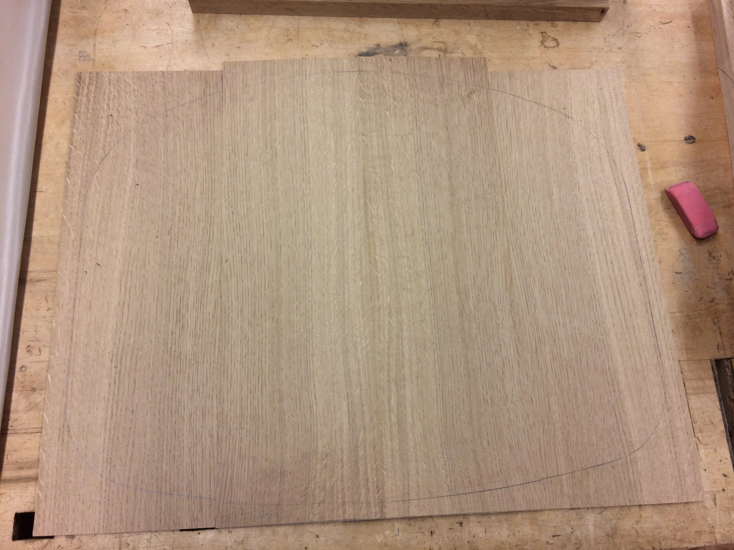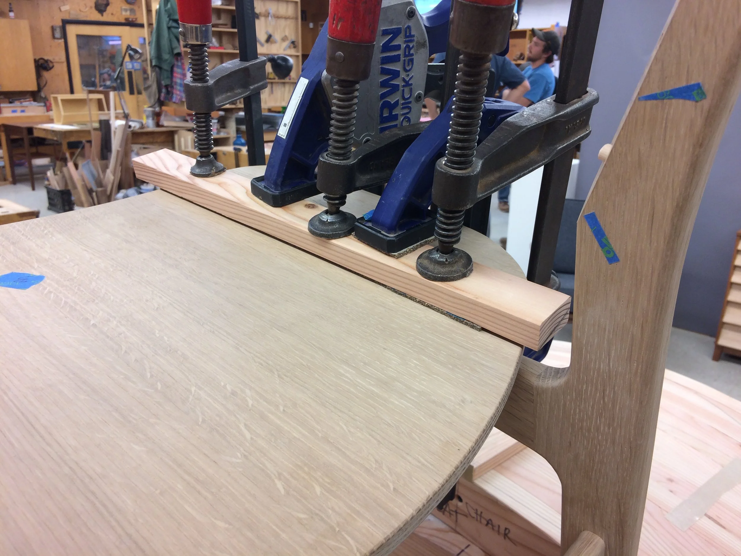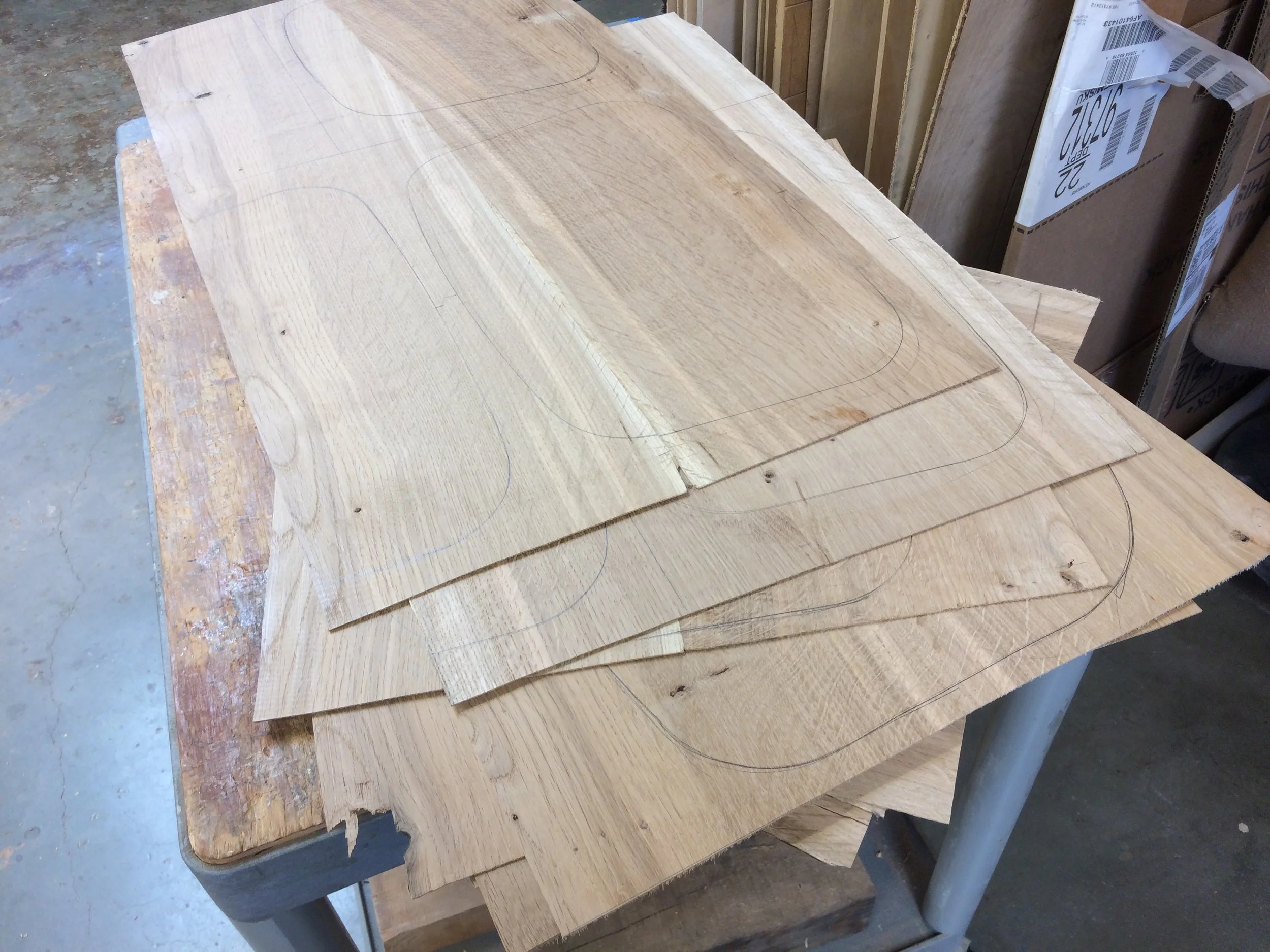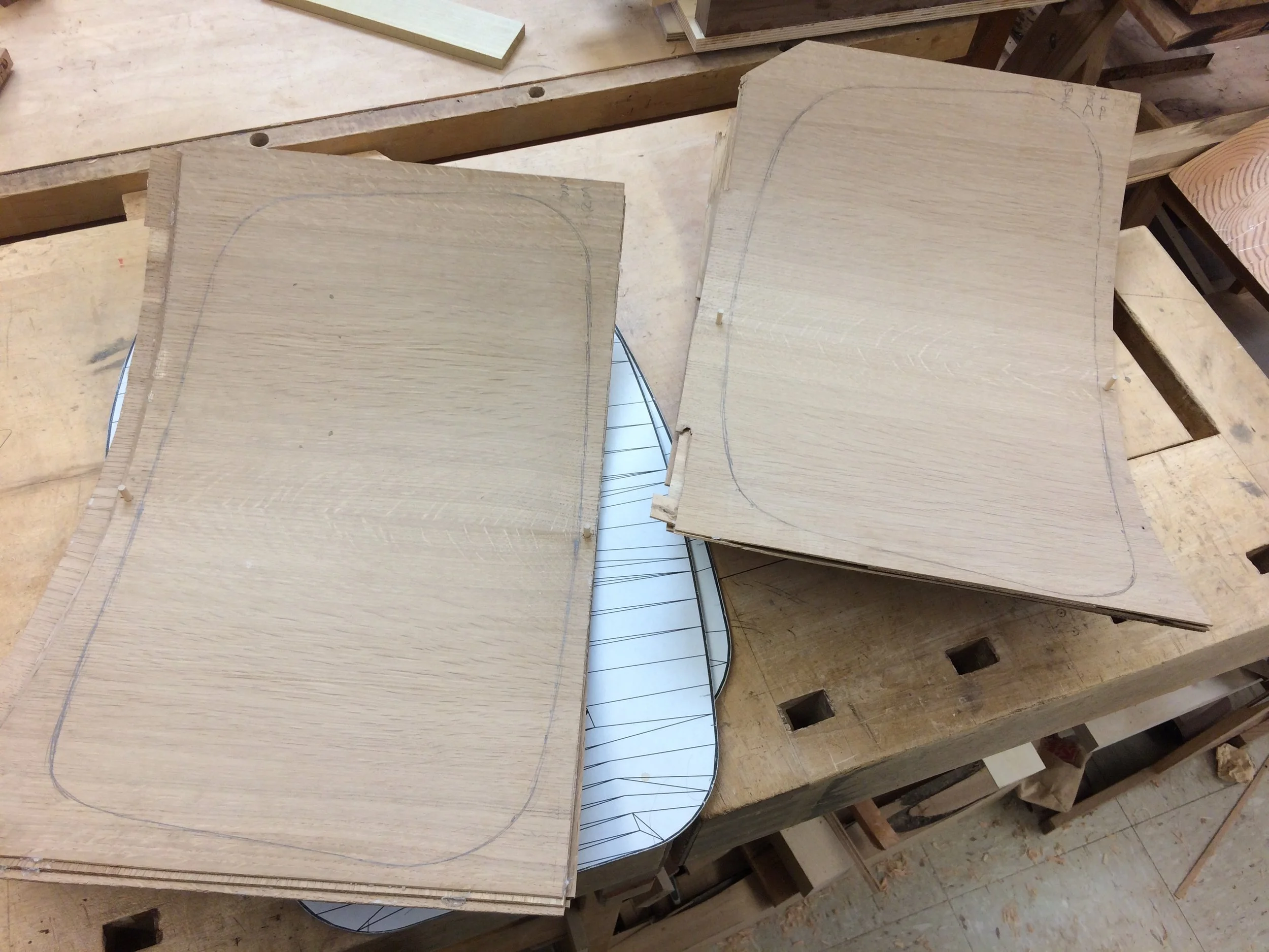 After a few hours in the press, the plywood shells are marked for bandsawing to the final contour.