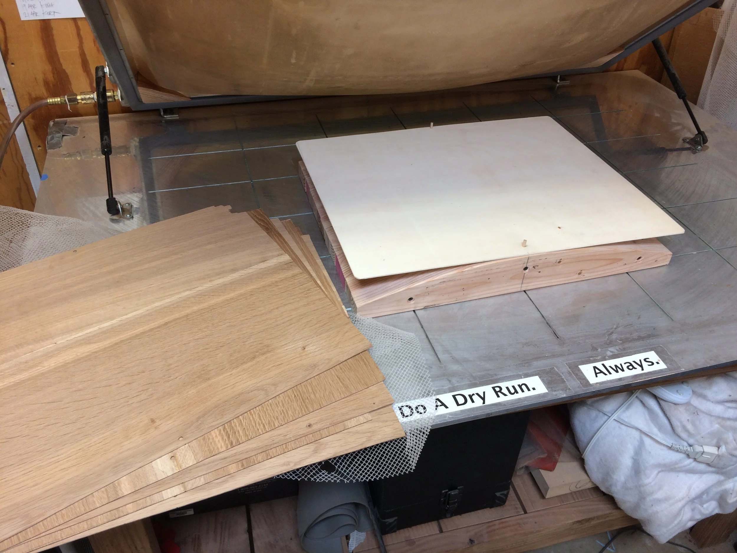 After re-sawing, planing, edge joining, and orienting 112 individual veneers, the final seven-ply stack is prepared for the vacuum press. Located with dowels so the show faces' bookmatched seams are aligned with the center of the buck.