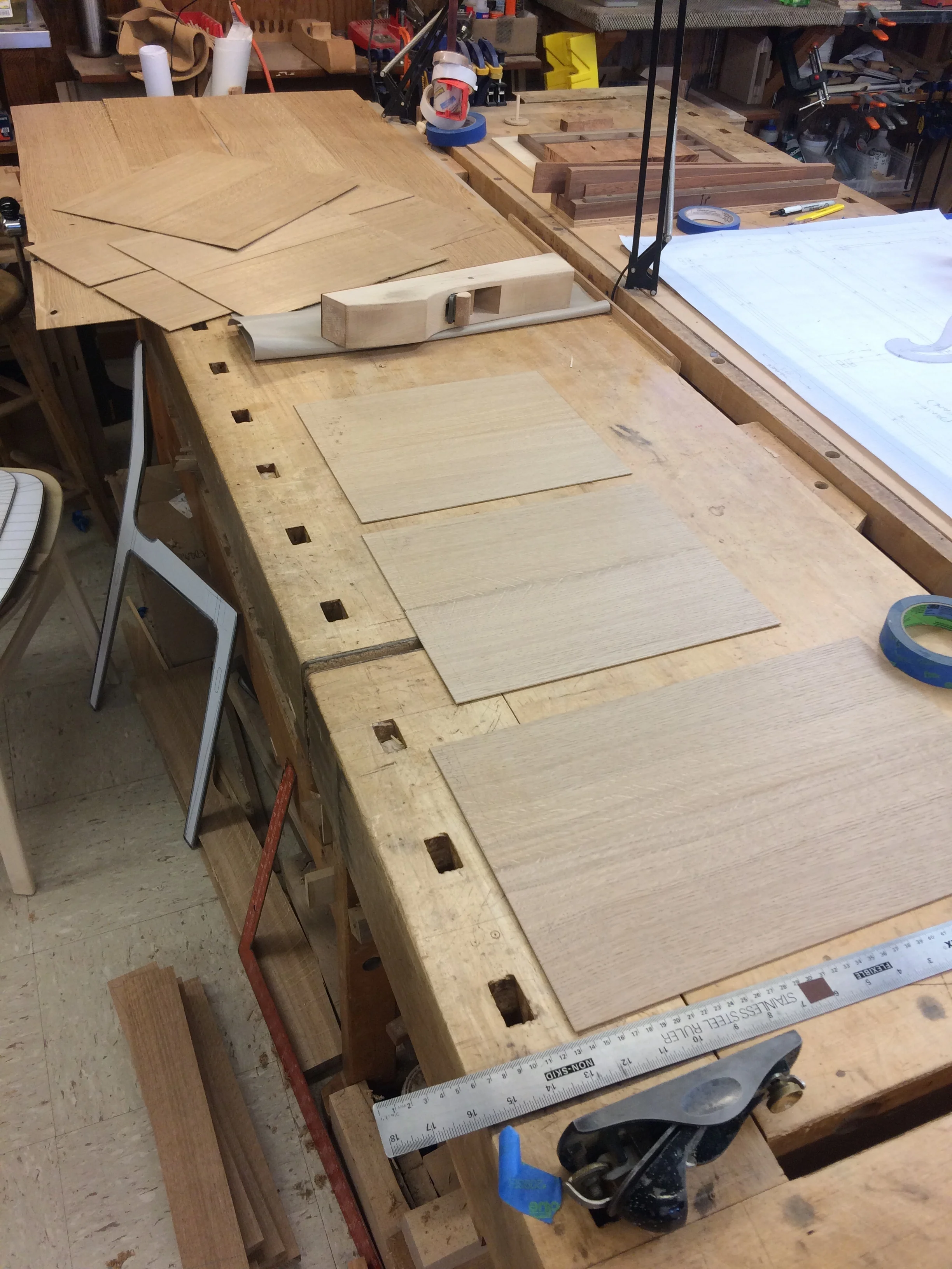 Glue four individual veneers along their edges to create wider sheets that will become one of seven plys per shell piece.